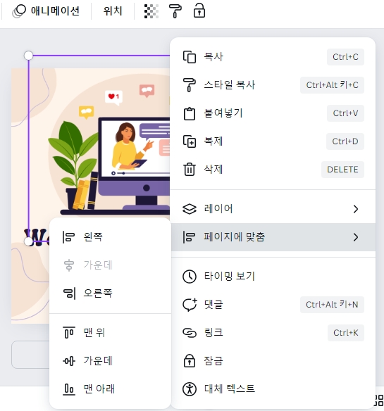 - 원하는 그림을 선택하고 오른쪽 마우스를 누르면 '레이어' 혹은 '페이지에 맞춤'을 이용하여 요소들을 이동시킬 수 있습니다. 아니면 화면 맨 위의 '위치'를 누르면 레이어나 정렬을 선택하여 위치를 변경할 수 있습니다.