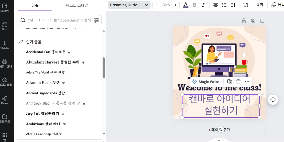 - 텍스트 추가: 다양한 텍스트 상자 스타일이 제공됩니다. 원하는 글꼴, 크기, 색상을 선택할 수 있습니다. 다양한 언어들도 사용할 수 있습니다. 왼쪽 도구에서 텍스트를 선택하고 글씨를 씁니다. 그 후 변경을 원한다면 쓴 텍스트를 선택하고 위쪽에 나타나는 글꼴을 눌러 글꼴 변경 및 사이즈, 두께등을 변경할 수 있습니다.
